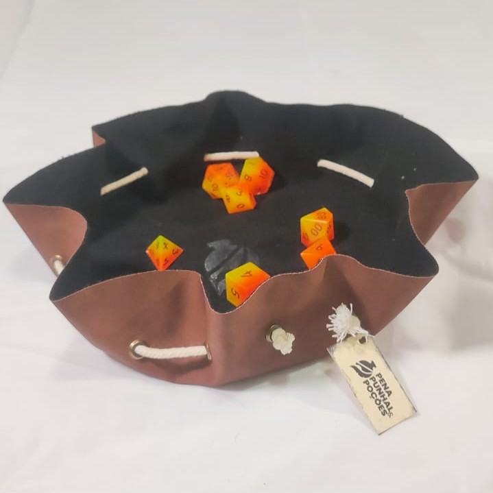 Em meio à floresta densa ou no salão iluminado de uma taverna, todo aventureiro precisa de um item confiável ao seu lado. Nossa Algibeira Porta Dados é essa companheira: produzida artesanalmente, em courino com acabamento em cordão trançado de algodão cru.